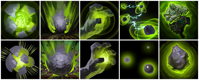 O usuário encanta temporariamente um herói, fornecendo-lhe as propriedades de um Resquício Rochoso. Após um curto período o resquício estilhaça, libertando o herói e causando dano a inimigos próximos.