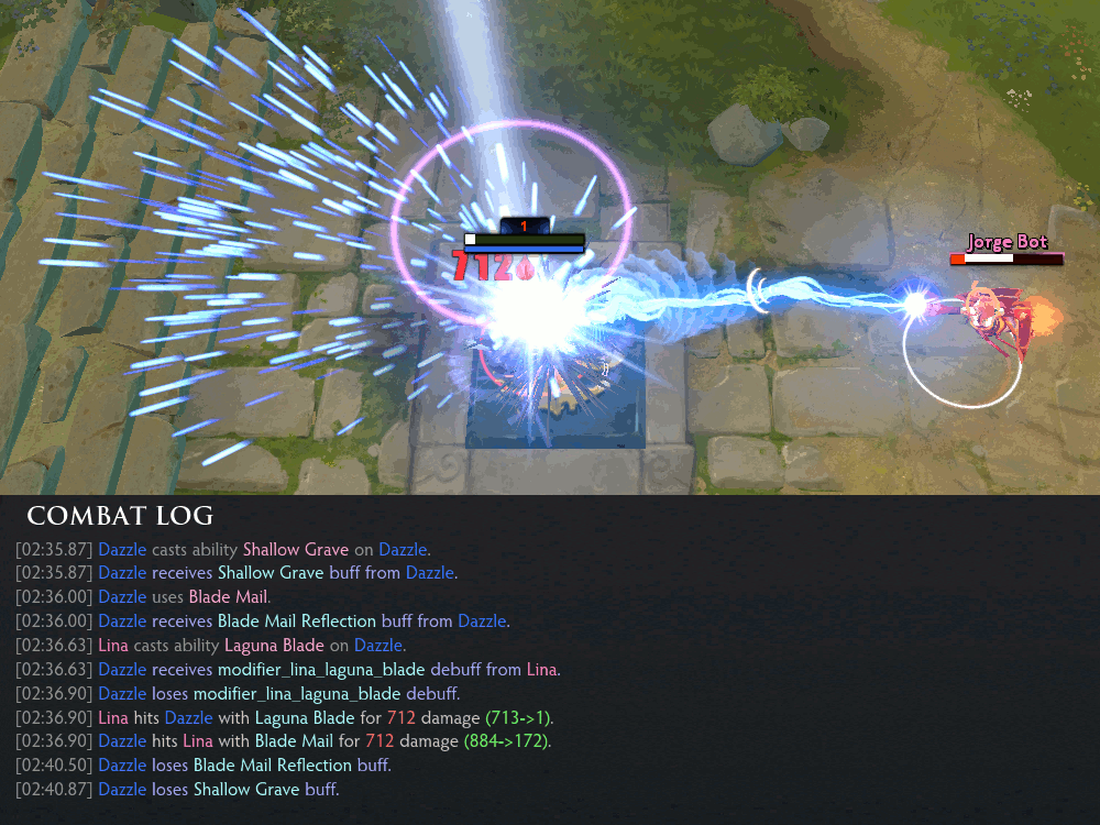 Lina применяет Laguna Blade на Dazzle с малым запасом здоровья под эффектом Shallow Grave и Blade Mail. Lina получает весь урон Laguna Blade.