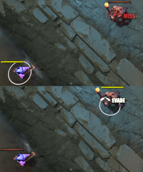 A more concrete way of thinking about evasion stacking is that for an attack to bypass an evasion stack and hit, the attack should bypass each source of evasion in sequence. Only if all sources of evasion fail can the attack deal attack damage. Consider the chance to be hit, which is 1 - evade chance. A unit's chance to be hit is inversely proportional to its effective HP against attacks. Stacking multiple evasion sources is equivalent to multiplying their corresponding chance to hit. In this way, evasion's effectiveness can be understood to be stacking multiplicatively — while the actual chance to evade is diminishing, each source of evasion increases effective HP against physical attacks more than the last due to this multiplicative nature. This affects the following things: