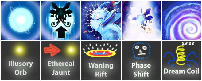 | Hatched on the frond of the Undertree, Puck's youthful mischievousness belied inscrutable motives. By teleporting to its Illusory Orb to Jaunt through short distances, it attacks and disrupt foes with bursts of Silencing Dust, Phase Shifting in and out of existence to avoid swords and spells alike. Equally adept at fighting and play, Puck Coils its foes to a single point, forcing them to break their restraints and be stunned, or stay and face Puck's advancing allies. | |